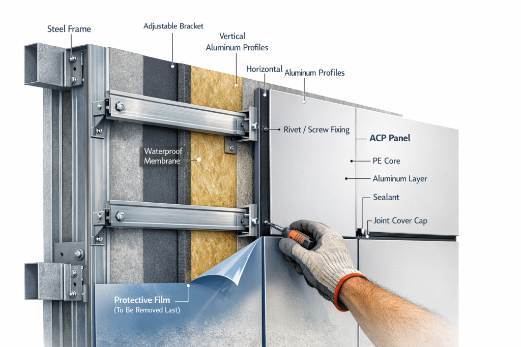 ACP panel bukan elemen struktural utama, melainkan sistem cladding atau pelapis. Panel dipasang pada rangka hollow galvanis atau aluminium yang terhubung ke struktur bangunan.
