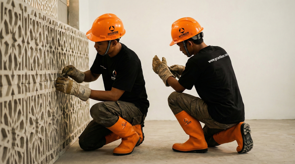 Panel GRC bekerja sebagai secondary skin bangunan. Beban utama tetap ditopang oleh struktur utama, sedangkan GRC berfungsi sebagai pelindung dan estetika.