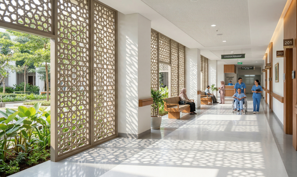 Salah satu aplikasi GRC yang paling relevan untuk rumah sakit adalah penggunaannya sebagai secondary skin berbentuk krawangan. Panel GRC berlubang berpola ini dipasang di depan dinding utama bangunan dan bekerja sebagai filter alami yang sangat efektif.