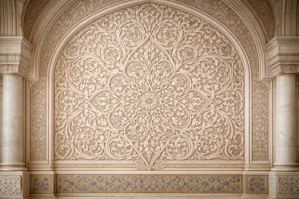 Selain struktur lengkungan, ornamen menjadi bagian penting dalam memperkaya permukaan arsitektur masjid. Salah satu bentuk yang paling dominan adalah motif arabesque.