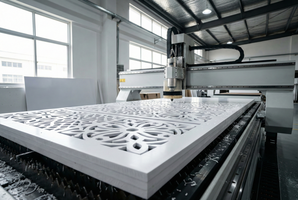 Dalam konteks bangunan masjid dan fasad modern, mesin CNC memungkinkan pembuatan motif krawangan dengan detail rumit yang tetap konsisten antar panel.